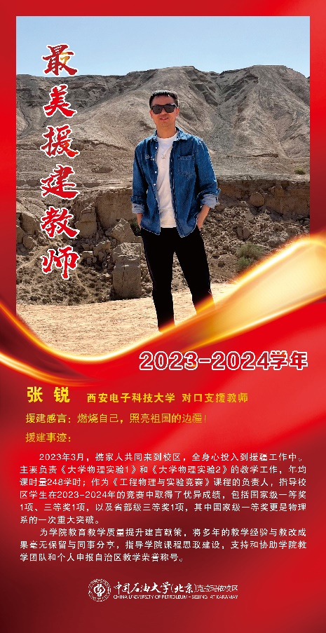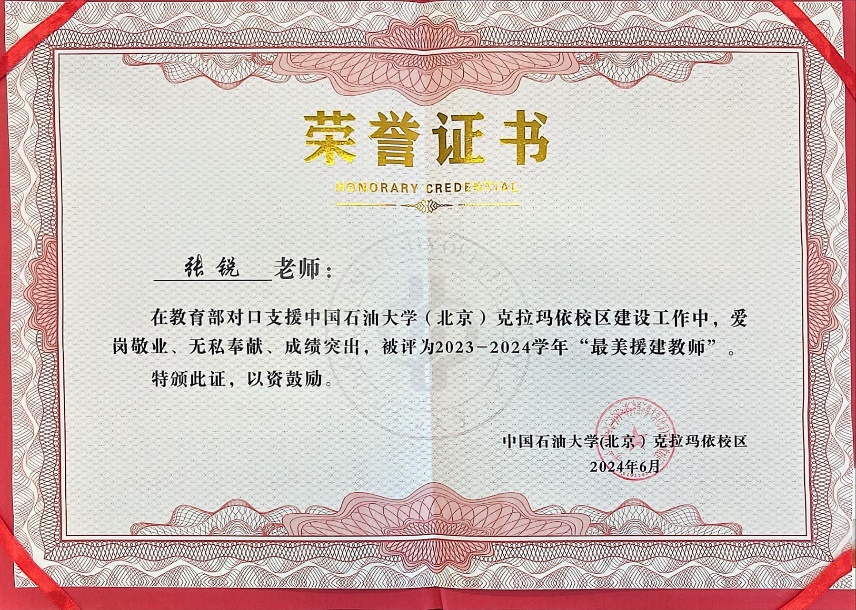 2022年8月,PA捕鱼官方网站教师张锐响应教育部关于支援西部建设、助力教育强国政策,前往中国石油大学(北京)克拉玛依校区物理系进行对口援建工作。2024年6月获得克拉玛依校区首届“执教天山下”援建文化节2023-2024学年“最美援建教师”称号,并作为“最美援建教师”代表接受克拉玛依市融媒体中心的采访。