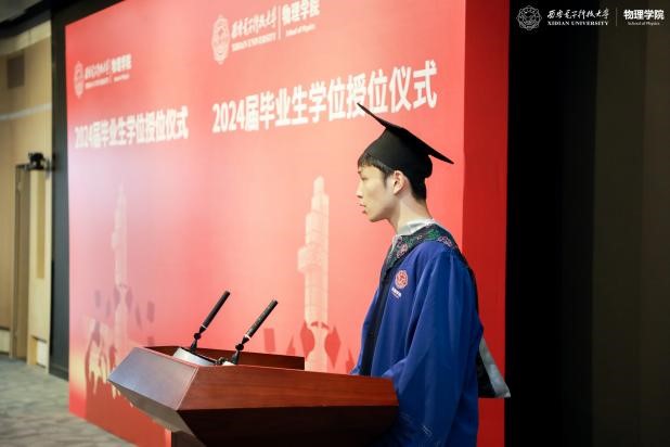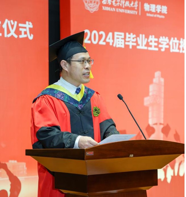 授位仪式在庄严的国歌中正式拉开帷幕。学位评定委员会主席郭立新教授宣读授位决定并致辞,他嘱咐毕业生要秉持科学探索的精神,深入洞察世界的奥秘;要怀抱精进钻研的初心,踏实奋进,追求卓越;要胸怀远大理想,施展理工交融的才华,勇攀科技高峰;更要将所学用于国家发展,争做新时代的强国先锋。
