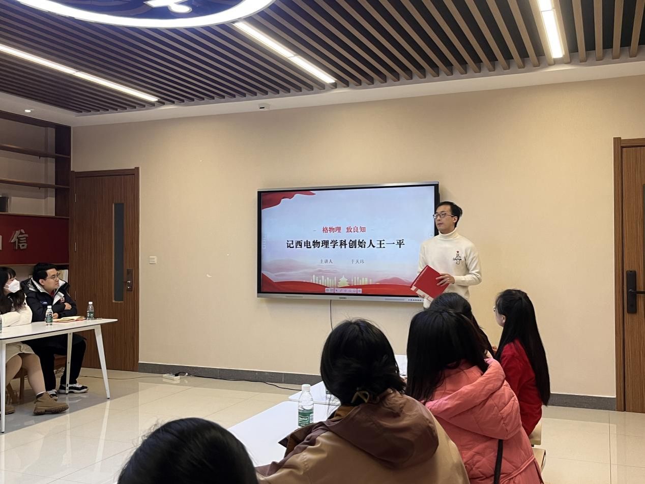 PA捕鱼官方网站硕士2023级党支部书记于天玮作了《格物理致良知——记西电物理学科创始人王一平》主题宣讲,讲述了西电物理学科创始人王一平的传奇故事,包括武汉大学地下党的革命经历、创办物理学科、物理师资班人才培养等,回顾了王一平教授一生的奋斗历程和革命、教育贡献,勉励同学们传承红色血脉,赓续科学家精神,为新时代物理学科和基础科学发展作出自己的贡献。