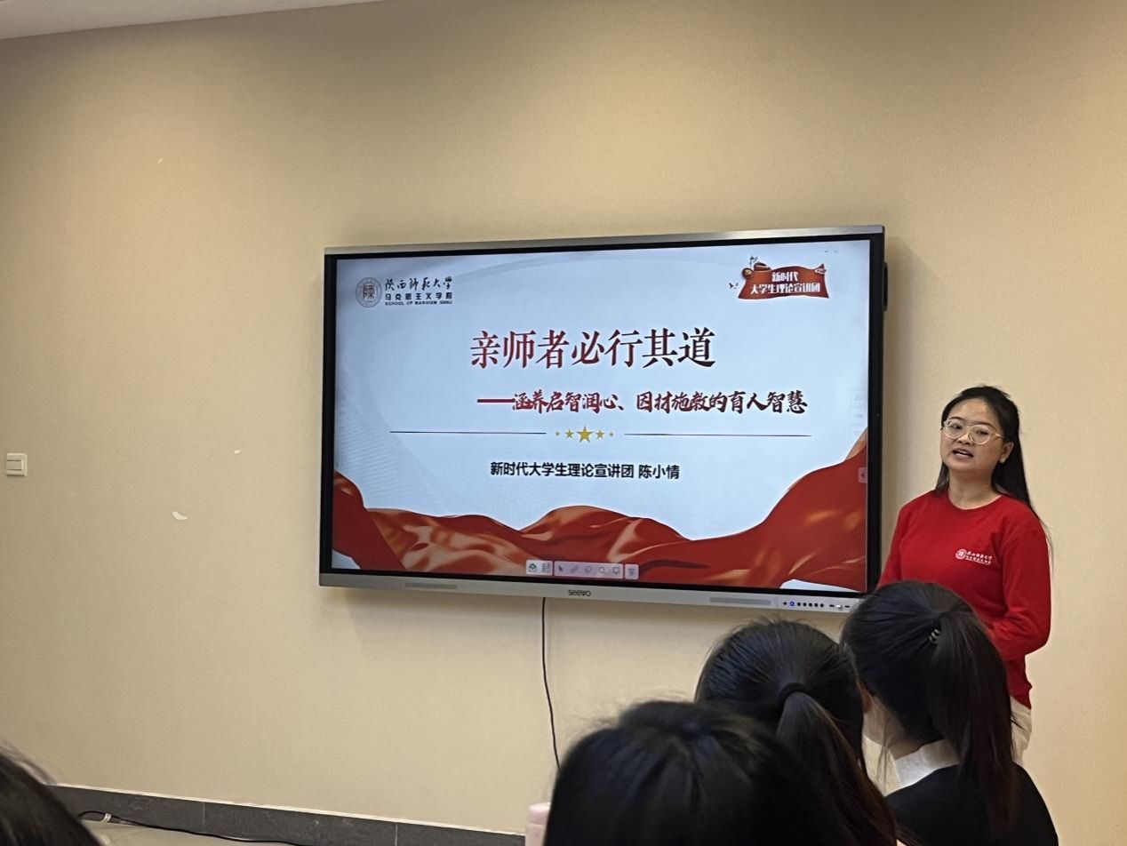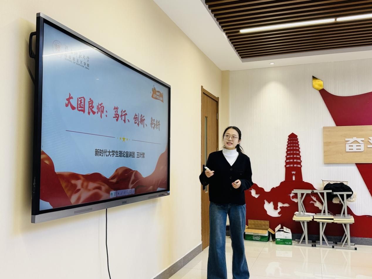 活动伊始,陕师大新时代大学生理论宣讲团成员2022级本科生王叶繁作了题为《勤学笃行、求是创新——做躬耕教坛的大国良师》的宣讲。从勤学、求是、创新、躬耕的角度,讲述了教育家精神和大国良师的精神内核,以首届“西部红烛两代师表奖”获得者章竹君和青年教师代表张莎莎的故事为引,刻画了西部红烛精神指引下的陕西师范大学,为中西部教育作出的辉煌贡献:超过30万毕业生投身基础教育事业、培养了38700余位公费师范生、90%的毕业生教师在中西部从教……