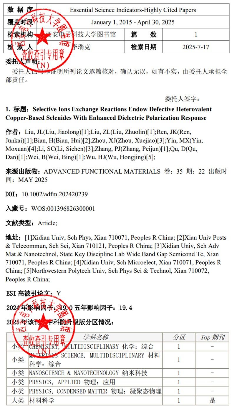 (通讯员:刘骄龙)据2025年7月Essential Science Indicators(简称ESI)统计数据显示,西电PA捕鱼官方网站魏兵教授团队青年教师刘骄龙以第一作者身份于2025年在《Advanced Functional Materials》(中科院I区TOP期刊,IF=19.0)上发表的研究成果“Selective Ions Exchange Reactions Endow Defective Heterovalent Coppe‐Based Selenides with Enhanced Dielectric Polarization Response”被ESI数据库遴选为高被引论文。