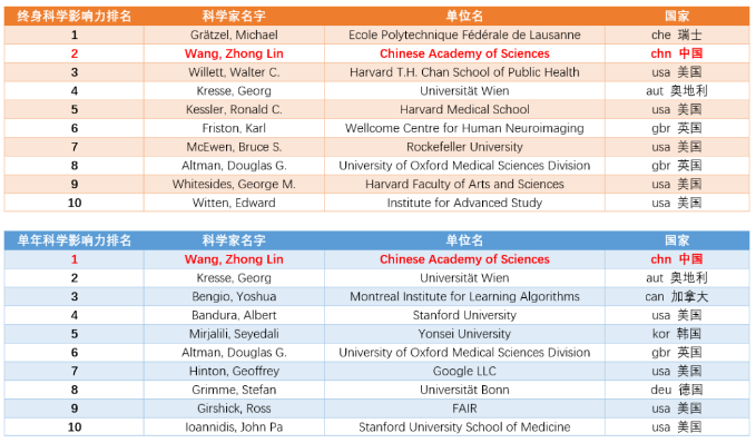 2023年10月4日,斯坦福大学团队与全球最大学术出版商Elsevier发布了最新一期世界“标准化引文指标全科学作者数据库”(截止到2023年10月1日),即全球前2%的10万名全科科学家的大数据排名榜单。在此最新一期公布的数据中,PA捕鱼官方网站校友王中林院士再次名列前茅:全学科职业生涯科学影响力(Career-long impact)排名第2;全学科单年度科学影响力(Single-year impact)排名继续保持第1名,并自2020年起已连续4年蝉联榜首。根据此榜单,王中林教授也是前100名中唯一来自中国的科学家。