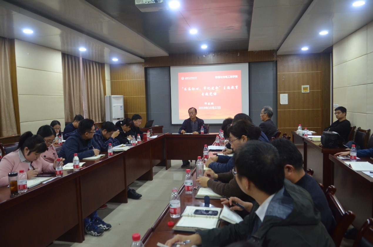 10月22日下午,在北校区西大楼412报告厅,物理与光电工程学院党委举行“不忘初心、牢记使命”主题教育专题党课,学院党委书记独国社、执行院长邵晓鹏主讲,学院两委委员、组织员、系所负责人、教工党支部书记、各党支部党员代表等参加听课,学校主题教育指导组成员宁静参加指导。独国社以“守初心、强党性、担使命、勇作为”为题,结合学院开展“不忘初心、牢记使命”主题教育情况分享了自己的学习体会。在讲对党的初心和使命...