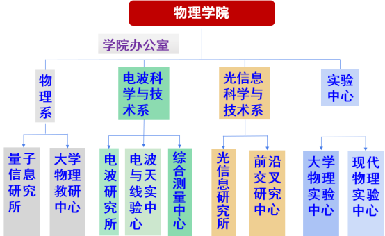 学院建立“三系三所六中心”,其中三系为物理系、电波科学与技术系*、光信息科学与技术系*;三所为量子信息研究所*、电波研究所、光信息研究所*;六中心为电波与天线实验中心、综合测量中心*、前沿交叉中心*、大学物理教研中心、大学物理实验中心、现代物理实验中心,带“*”为新增机构。